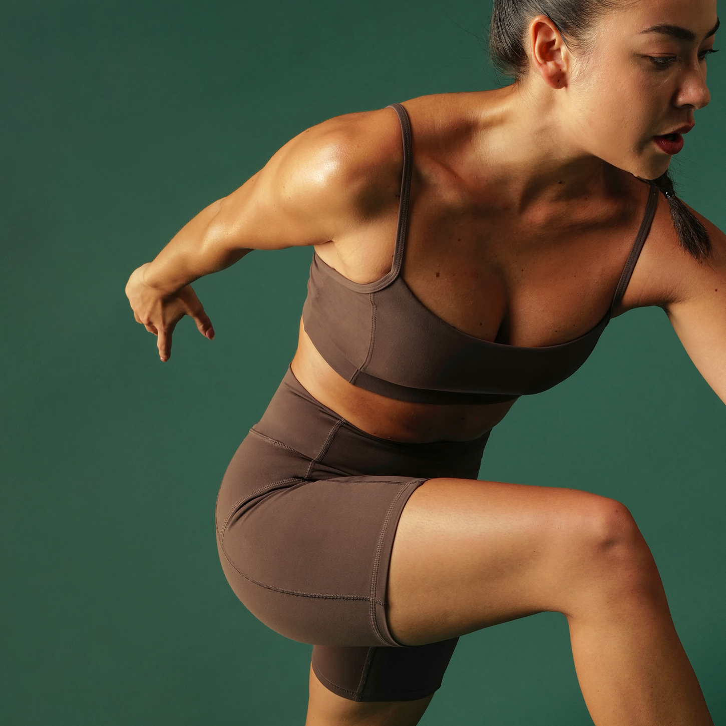 A performance-first fabric with firm, compressive hold and a slightly brushed, matte feel